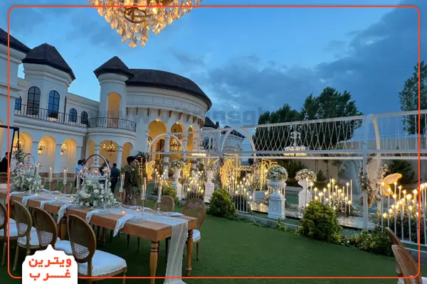 سبک فضای باز یا گاردنپارتی نیز در برخی باغ تالارهای غرب تهران اجرا میشود. در این مدل، نورپردازی ریسهای، استندهای گل طبیعی و چیدمان غیررسمیتر استفاده میشود که حس صمیمیت بیشتری ایجاد میکند و برای مراسمهای عصرگاهی گزینهای ایدهآل است.