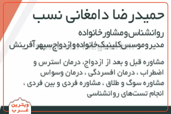 شماره نظام روانشناسی: 24687دارای پروانه اشتغال و پروانه تخصصی روانشناسیعضو سازمان نظام روانشناسی و مشاوره کشورهمکاری با سامانههای معتبر نوبتدهی آنلاین مانند دکتردکتر و پزشکان خوب🌿 اگر به دنبال آرامش ذهنی، روابط سالم و زندگی رضایتبخش هستید، دکتر حمیدرضا دامغانینسب با سالها تجربه و تخصص، همراه مطمئن شماست. 💬 جلسات کاملاً محرمانه و علمی برگزار میشوند.📍اطلاعات تماس: