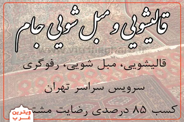 قالیشویی جام: از نیم قرن تجربه، تخصص در فرشهای نفیس، خدمات حرفهای در سراسر تهران قالیشویی جام با بیش از ۵۰ سال سابقه در صنعت شستشوی فرش، موکت و مبلمان، یکی از معتبرترین و بزرگترین مراکز قالیشویی در غرب تهران است. این مجموعه با بهرهگیری از دستگاههای مدرن، مواد شوینده درجهیک و پرسنل متخصص، خدماتی با کیفیت بالا و ضمانت کتبی به مشتریان خود ارائه میدهد.